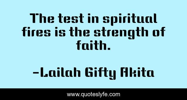 This page presents the quote "The test in spiritual fires is the strength of faith.". Author of this quote is Lailah Gifty Akita. This quote is about faith, christian, spiritual-wisdom, encouragement, failure, difficulties-of-life, never-give-up,.