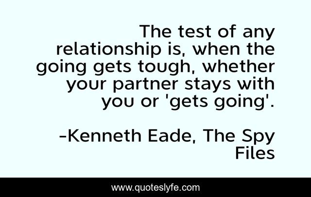 This page presents the quote "The test of any relationship is, when the going gets tough, whether your partner stays with you or 'gets going'.". Author of this quote is Kenneth Eade, The Spy Files. This quote is about breaking-up, breakup, relationships,.