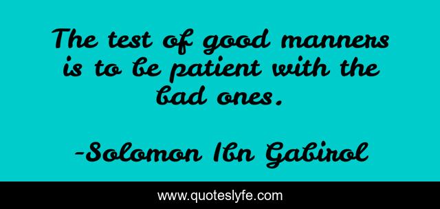 This page presents the quote "The test of good manners is to be patient with the bad ones.". Author of this quote is Solomon Ibn Gabirol. This quote is about test, bad, good,.