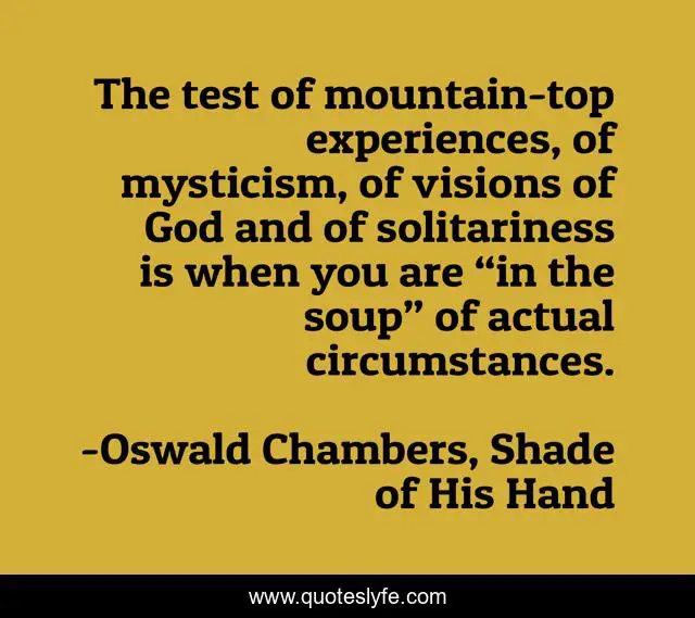 This page presents the quote "The test of mountain-top experiences, of mysticism, of visions of God and of solitariness is when you are “in the soup” of actual circumstances.". Author of this quote is Oswald Chambers, Shade of His Hand. This quote is about mysticism, discipleship,.