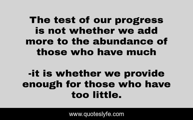 This page presents the quote "The test of our progress is not whether we add more to the abundance of those who have much". Author of this quote is it is whether we provide enough for those who have too little.. .