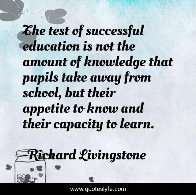 This page presents the quote "The test of successful education is not the amount of knowledge that pupils take away from school, but their appetite to know and their capacity to learn.". Author of this quote is Richard Livingstone. This quote is about education, learning,.
