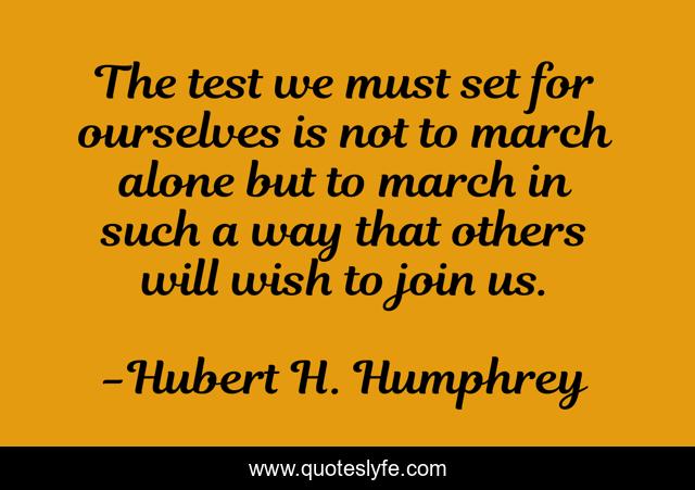 This page presents the quote "The test we must set for ourselves is not to march alone but to march in such a way that others will wish to join us.". Author of this quote is Hubert H. Humphrey. This quote is about pride, friendship, honor, recovery,.