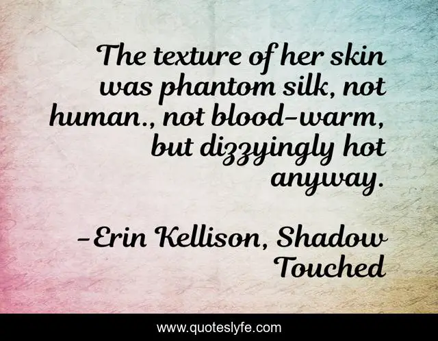 This page presents the quote "The texture of her skin was phantom silk, not human., not blood-warm, but dizzyingly hot anyway.". Author of this quote is Erin Kellison, Shadow Touched. This quote is about dark-paranormal, uf, suspense,.