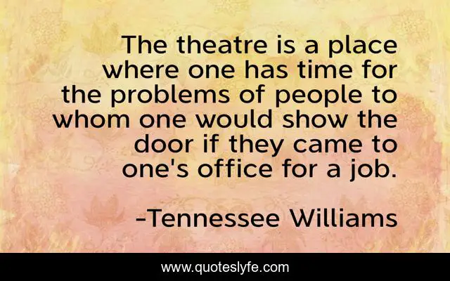 This page presents the quote "The theatre is a place where one has time for the problems of people to whom one would show the door if they came to one's office for a job.". Author of this quote is Tennessee Williams. This quote is about jobs, problems, office, theatre, people,.