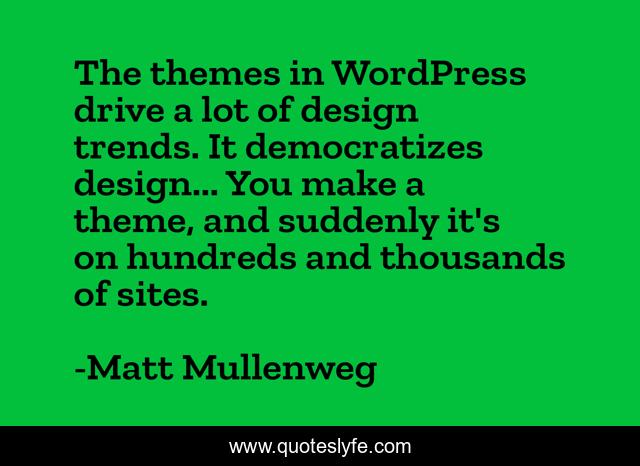 This page presents the quote "The themes in WordPress drive a lot of design trends. It democratizes design... You make a theme, and suddenly it's on hundreds and thousands of sites.". Author of this quote is Matt Mullenweg. This quote is about trends, drive,.