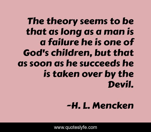 This page presents the quote "The theory seems to be that as long as a man is a failure he is one of God's children, but that as soon as he succeeds he is taken over by the Devil.". Author of this quote is H. L. Mencken. This quote is about god, children, man,.