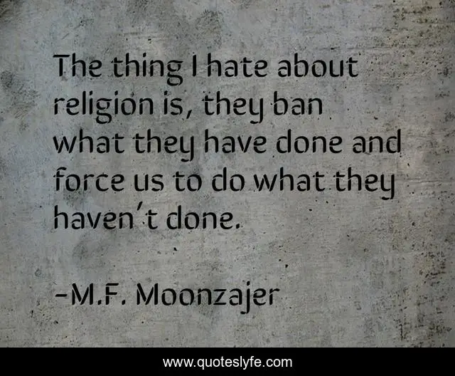 This page presents the quote "The thing I hate about religion is, they ban what they have done and force us to do what they haven’t done.". Author of this quote is M.F. Moonzajer. This quote is about ban, religion, force,.