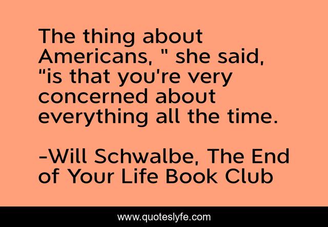 This page presents the quote "The thing about Americans, ” she said, “is that you’re very concerned about everything all the time.". Author of this quote is Will Schwalbe, The End of Your Life Book Club. This quote is about worry, concern,.