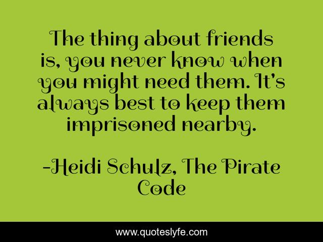 This page presents the quote "The thing about friends is, you never know when you might need them. It's always best to keep them imprisoned nearby.". Author of this quote is Heidi Schulz, The Pirate Code. This quote is about humor, friends, friendship,.