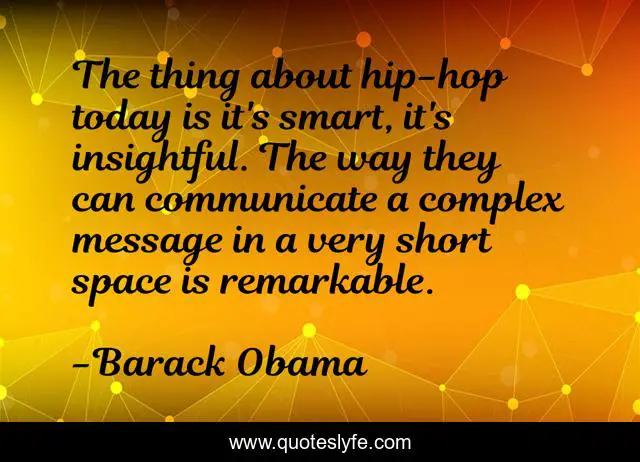 This page presents the quote "The thing about hip-hop today is it's smart, it's insightful. The way they can communicate a complex message in a very short space is remarkable.". Author of this quote is Barack Obama. This quote is about short, today, smart,.