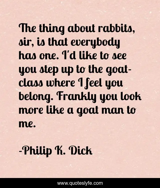 This page presents the quote "The thing about rabbits, sir, is that everybody has one. I'd like to see you step up to the goat-class where I feel you belong. Frankly you look more like a goat man to me.". Author of this quote is Philip K. Dick. .