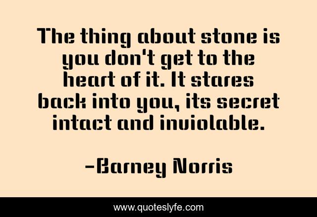 This page presents the quote "The thing about stone is you don't get to the heart of it. It stares back into you, its secret intact and inviolable.". Author of this quote is Barney Norris. .