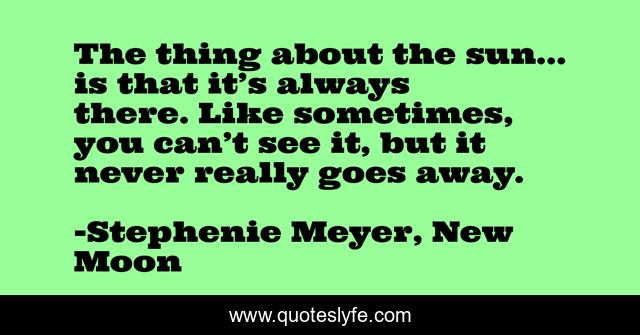 This page presents the quote "The thing about the sun… is that it’s always there. Like sometimes, you can’t see it, but it never really goes away.". Author of this quote is Stephenie Meyer, New Moon. .