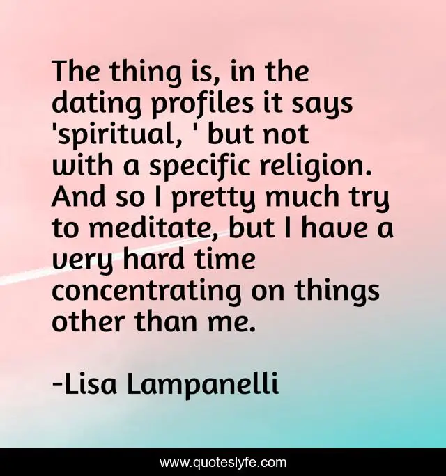 This page presents the quote "The thing is, in the dating profiles it says 'spiritual, ' but not with a specific religion. And so I pretty much try to meditate, but I have a very hard time concentrating on things other than me.". Author of this quote is Lisa Lampanelli. This quote is about religion, spiritual, time,.