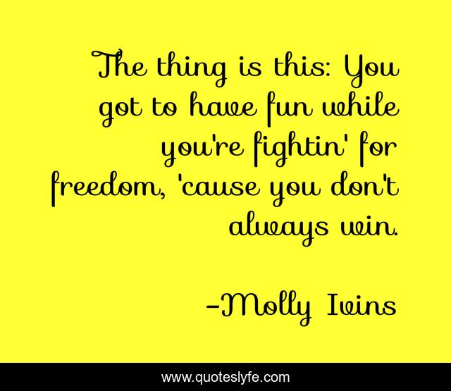 This page presents the quote "The thing is this: You got to have fun while you're fightin' for freedom, 'cause you don't always win.". Author of this quote is Molly Ivins. This quote is about fun, freedom, win,.