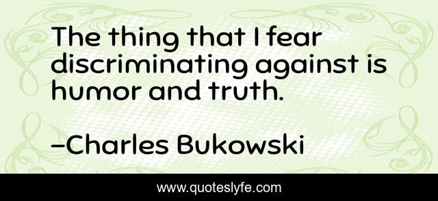 This page presents the quote "The thing that I fear discriminating against is humor and truth.". Author of this quote is Charles Bukowski. This quote is about fear, truth, against,.