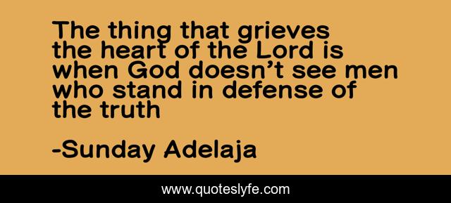 This page presents the quote "The thing that grieves the heart of the Lord is when God doesn’t see men who stand in defense of the truth". Author of this quote is Sunday Adelaja. This quote is about heart, god, grieves, men, thing, see, defense, stand, truth,.