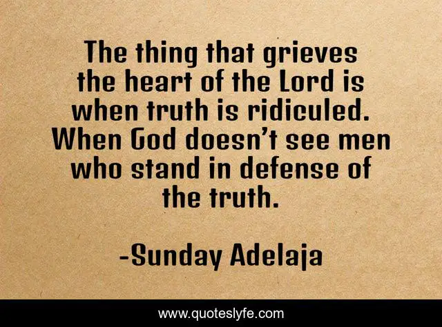 This page presents the quote "The thing that grieves the heart of the Lord is when truth is ridiculed. When God doesn’t see men who stand in defense of the truth.". Author of this quote is Sunday Adelaja. This quote is about heart, ridiculed, god, grieves, men, thing, see, defense, stand,.
