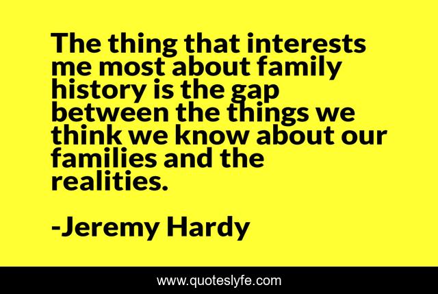This page presents the quote "The thing that interests me most about family history is the gap between the things we think we know about our families and the realities.". Author of this quote is Jeremy Hardy. This quote is about me, family,.