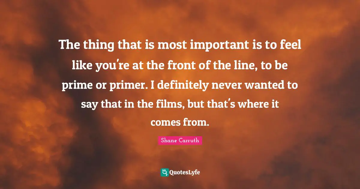 This page presents the quote "The thing that is most important is to feel like you're at the front of the line, to be prime or primer. I definitely never wanted to say that in the films, but that's where it comes from.". Author of this quote is Shane Carruth. This quote is about prime, wanted, important, film, like you, lines,.