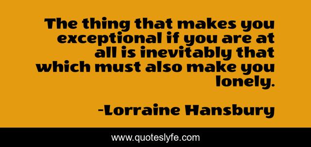 This page presents the quote "The thing that makes you exceptional if you are at all is inevitably that which must also make you lonely.". Author of this quote is Lorraine Hansbury. This quote is about self, acceptance,.