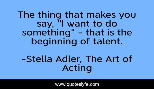 This page presents the quote "The thing that makes you say, "I want to do something" - that is the beginning of talent.". Author of this quote is Stella Adler, The Art of Acting. This quote is about talent, goals-in-life, self-realization, acting, inspirational, self-motivation, enthusiasm, dreams,.