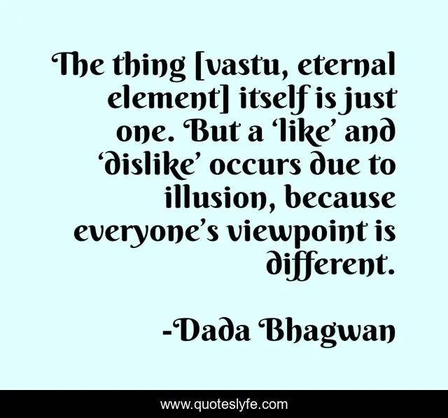 This page presents the quote "The thing [vastu, eternal element] itself is just one. But a ‘like’ and ‘dislike’ occurs due to illusion, because everyone’s viewpoint is different.". Author of this quote is Dada Bhagwan. This quote is about spiritual, viewpoint, like-dislike, illusion, vastu, eternal-elements,.