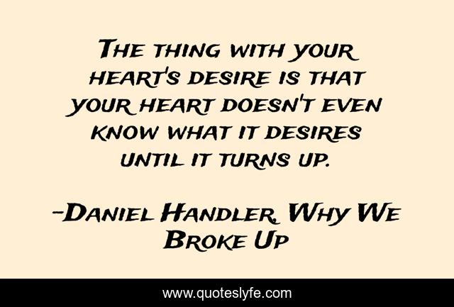 This page presents the quote "The thing with your heart's desire is that your heart doesn't even know what it desires until it turns up.". Author of this quote is Daniel Handler, Why We Broke Up. This quote is about love, affection,.