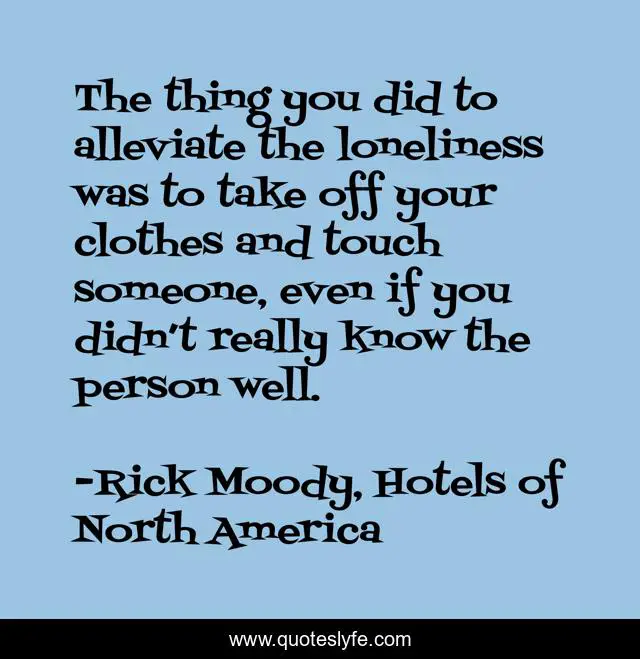 This page presents the quote "The thing you did to alleviate the loneliness was to take off your clothes and touch someone, even if you didn’t really know the person well.". Author of this quote is Rick Moody, Hotels of North America. .