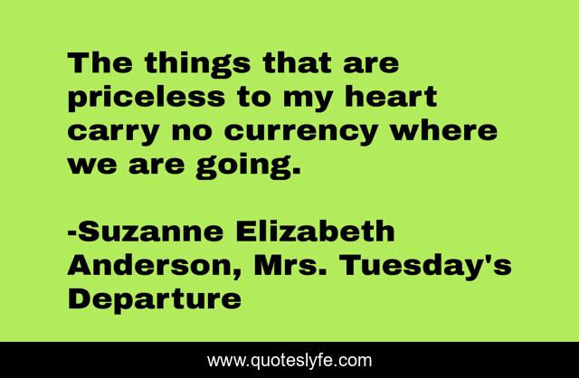 This page presents the quote "The things that are priceless to my heart carry no currency where we are going.". Author of this quote is Suzanne Elizabeth Anderson, Mrs. Tuesday's Departure. This quote is about heartbreak, love, affection,.