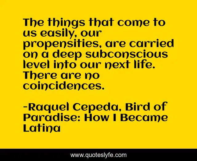 This page presents the quote "The things that come to us easily, our propensities, are carried on a deep subconscious level into our next life. There are no coincidences.". Author of this quote is Raquel Cepeda, Bird of Paradise: How I Became Latina. This quote is about journeying, afterlife, ancestral-memory, no-coincidence, coincidence, subconscious, propensities, life-journey, spiritual-journey,.
