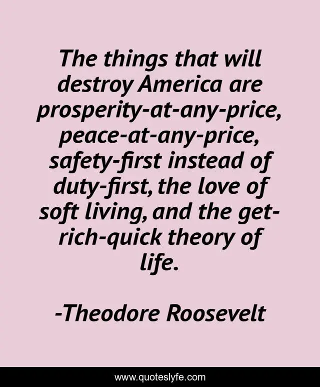 The things that will destroy America are prosperity-at-any-price, peace-at-any-price, safety-first instead of duty-first, the love of soft living, and the get-rich-quick theory of life.