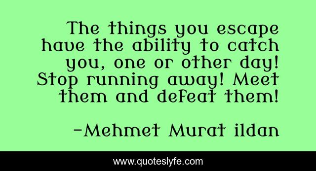 This page presents the quote "The things you escape have the ability to catch you, one or other day! Stop running away! Meet them and defeat them!". Author of this quote is Mehmet Murat ildan. This quote is about turkish-aphorisms, escape-from-evil, escaping, mehmet-murat-ildan, ildan-wise-sayings, turkish, ildan-wisdom, turkish-sayings, turkish-playwrights,.