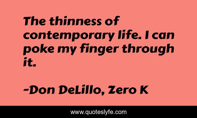 This page presents the quote "The thinness of contemporary life. I can poke my finger through it.". Author of this quote is Don DeLillo, Zero K. This quote is about ennui, life, postmodern, contemporary,.