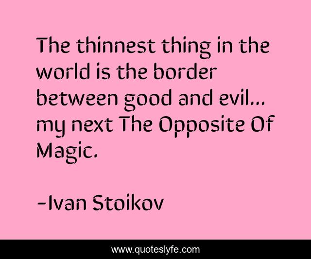 This page presents the quote "The thinnest thing in the world is the border between good and evil... my next The Opposite Of Magic.". Author of this quote is Ivan Stoikov. This quote is about good, magic, wizards, evil, fantasy, books, sci-fy, science-fiction, allan-bard,.