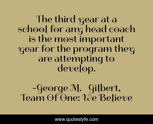This page presents the quote "The third year at a school for any head coach is the most important year for the program they are attempting to develop.". Author of this quote is George M. Gilbert, Team Of One: We Believe. This quote is about team-direction, confidence, football, success, positive, motivational, winning, coaching, optimistic,.