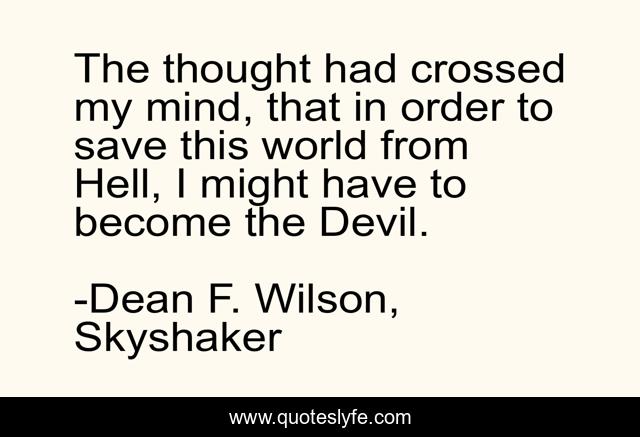 This page presents the quote "The thought had crossed my mind, that in order to save this world from Hell, I might have to become the Devil.". Author of this quote is Dean F. Wilson, Skyshaker. This quote is about hell, badass, devil, world,.