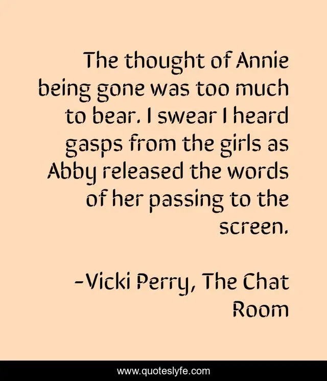 This page presents the quote "The thought of Annie being gone was too much to bear. I swear I heard gasps from the girls as Abby released the words of her passing to the screen.". Author of this quote is Vicki Perry, The Chat Room. This quote is about passing-away, quotes, book, the-chat-room,.