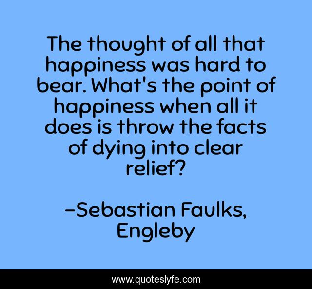 This page presents the quote "The thought of all that happiness was hard to bear. What's the point of happiness when all it does is throw the facts of dying into clear relief?". Author of this quote is Sebastian Faulks, Engleby. This quote is about dying, happiness, relief,.