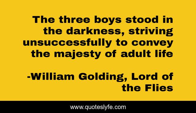 This page presents the quote "The three boys stood in the darkness, striving unsuccessfully to convey the majesty of adult life". Author of this quote is William Golding, Lord of the Flies. .