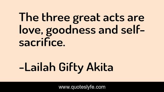 This page presents the quote "The three great acts are love, goodness and self-sacrifice.". Author of this quote is Lailah Gifty Akita. This quote is about confidence, love, positive, sacrifice, motivational, optimistic, good-deeds, affection,.