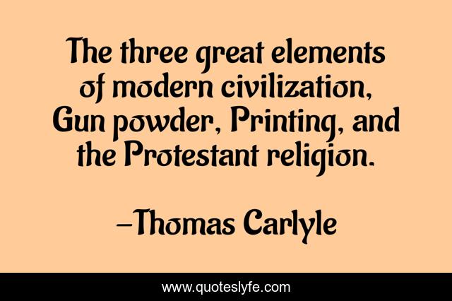This page presents the quote "The three great elements of modern civilization, Gun powder, Printing, and the Protestant religion.". Author of this quote is Thomas Carlyle. This quote is about great, three,.
