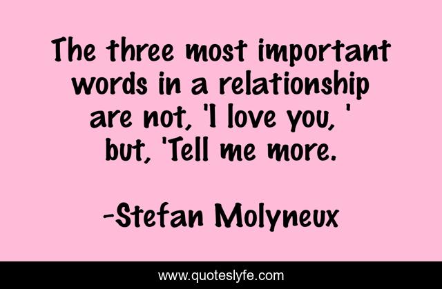 This page presents the quote "The three most important words in a relationship are not, 'I love you, ' but, 'Tell me more.". Author of this quote is Stefan Molyneux. This quote is about relationships, psychology, self-knowledge, philosophy, human-interaction, friendship, self-esteem,.