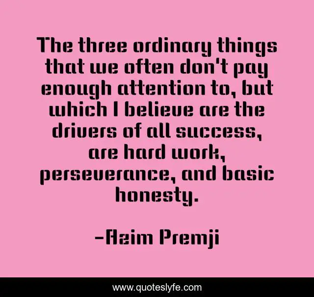 This page presents the quote "The three ordinary things that we often don't pay enough attention to, but which I believe are the drivers of all success, are hard work, perseverance, and basic honesty.". Author of this quote is Azim Premji. This quote is about success, hard work,.