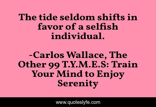 This page presents the quote "The tide seldom shifts in favor of a selfish individual.". Author of this quote is Carlos Wallace, The Other 99 T.Y.M.E.S: Train Your Mind to Enjoy Serenity. This quote is about selfishness, golden-goose, selfish, carlos-wallace, selfish-people,.