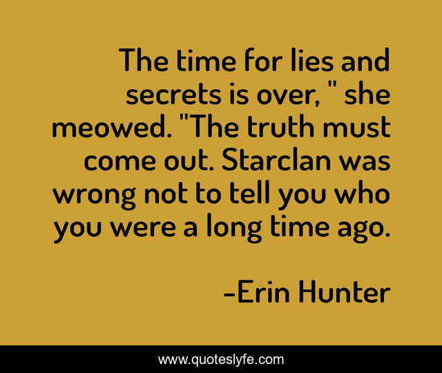 This page presents the quote "The time for lies and secrets is over, " she meowed. "The truth must come out. Starclan was wrong not to tell you who you were a long time ago.". Author of this quote is Erin Hunter. This quote is about secrets, jayfeather,.