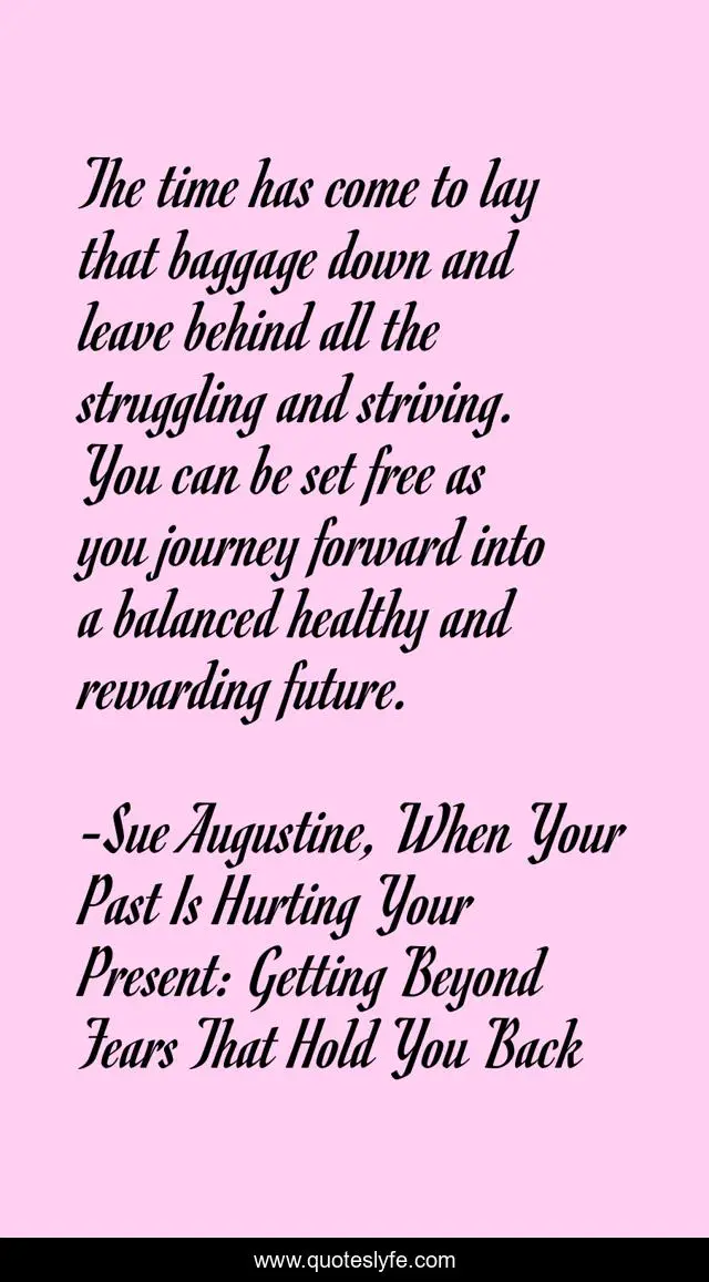 This page presents the quote "The time has come to lay that baggage down and leave behind all the struggling and striving. You can be set free as you journey forward into a balanced healthy and rewarding future.". Author of this quote is Sue Augustine, When Your Past Is Hurting Your Present: Getting Beyond Fears That Hold You Back. This quote is about past, baggage, future, struggle,.