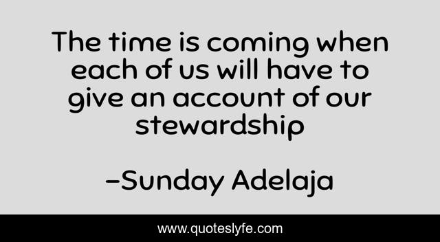 This page presents the quote "The time is coming when each of us will have to give an account of our stewardship". Author of this quote is Sunday Adelaja. This quote is about account, stewardship, calling, purpose, time, fulfillment,.