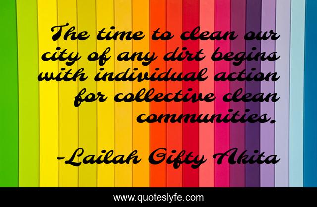 This page presents the quote "The time to clean our city of any dirt begins with individual action for collective clean communities.". Author of this quote is Lailah Gifty Akita. This quote is about clean-up, sanitation, cleanliness, actions, hygiene, individual, health, communities,.